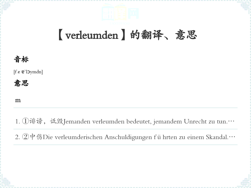 ①诽谤,诋毁Jemanden verleumden bedeutet, jemandem Unrecht zu tun. 诽谤某人意味着对某人不公。
