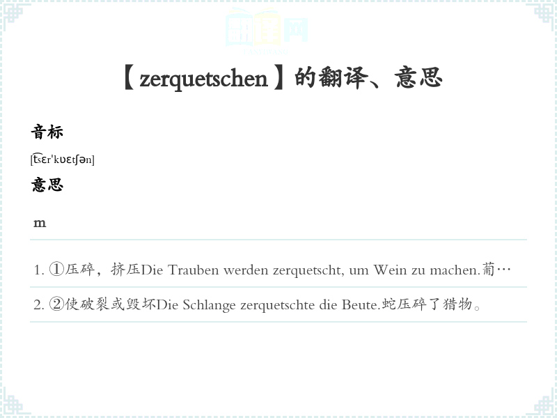 ②使破裂或毁坏Die Schlange zerquetschte die Beute.蛇压碎了猎物。