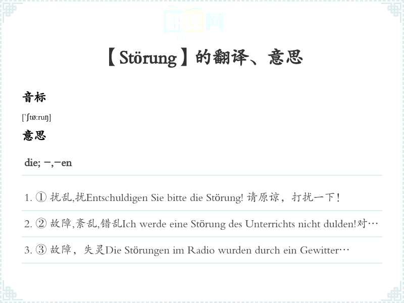 ② 故障,紊乱,错乱Ich werde eine Störung des Unterrichts nicht dulden!对上课扰我是不会容忍。