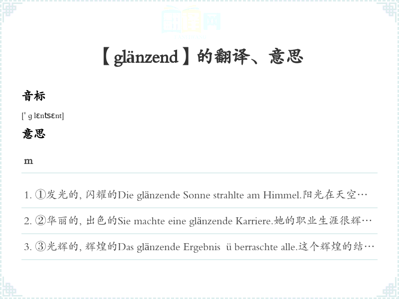 ③光辉的, 辉煌的Das glänzende Ergebnis überraschte alle.这个辉煌的结果让所有人都感到惊讶。