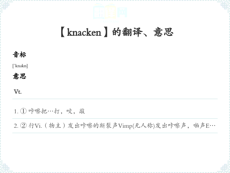 ② 行Vi.(物主)发出咔嚓的断裂声Vimp(无人称)发出咔嚓声,啪声Es knackt im Radio, im Telefon.收机、电话机里发出(有)咔嚓声。语法搭配+四格, mit+三格 德 语 助 手