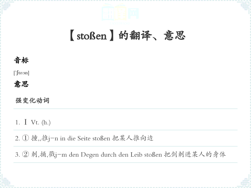 ② 偶然发现,偶然遇见Im Urlaub stieß ich auf einen alten Bekannten. 休假时我(偶然)到位老相识。bei j-m auf Ablehnung stoßen 遭到某人拒绝