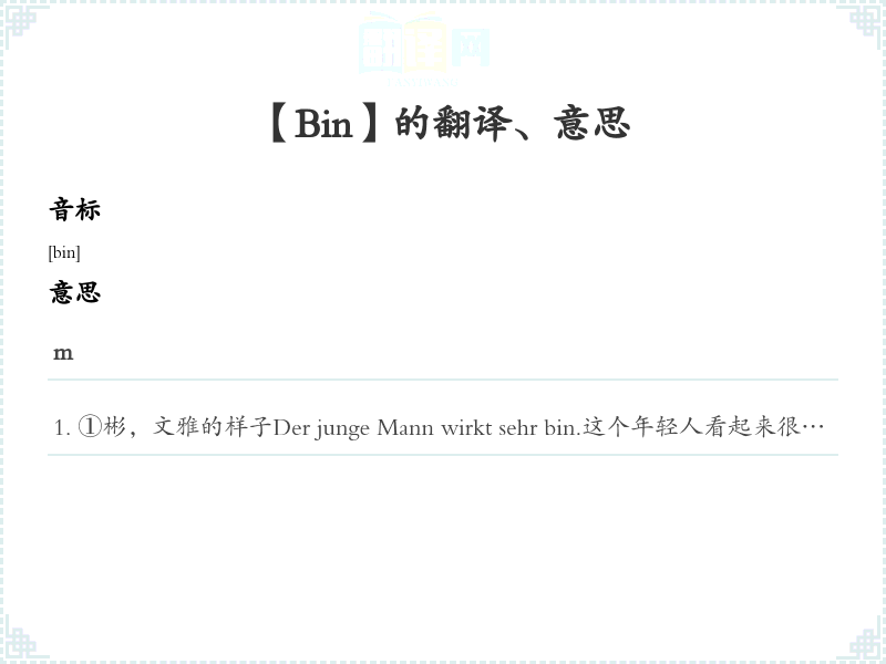 ①彬,文雅的样子Der junge Mann wirkt sehr bin.这个年轻人看起来很彬。