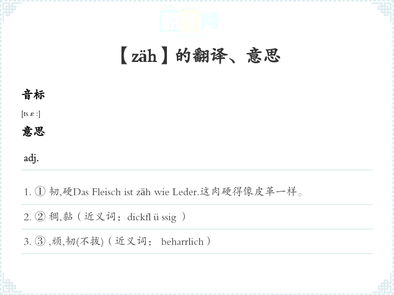 ① 韧,硬Das Fleisch ist zäh wie Leder.这肉硬得像皮革一样。