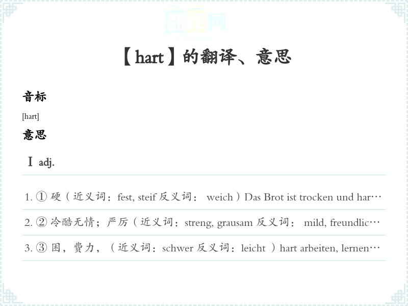 ① 硬(近义词:fest, steif 反义词: weich)Das Brot ist trocken und hart.面包又干又硬。Die Erde ist so ausgetrocknet, dass sie ganz hart ist.土地由于干涸而变硬了。