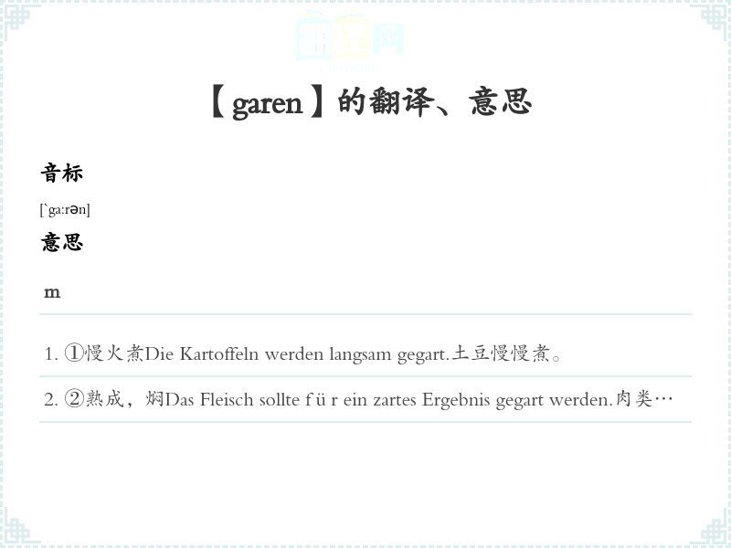 ②熟成,焖Das Fleisch sollte für ein zartes Ergebnis gegart werden.肉类应该焖煮以获得鲜嫩的效果。