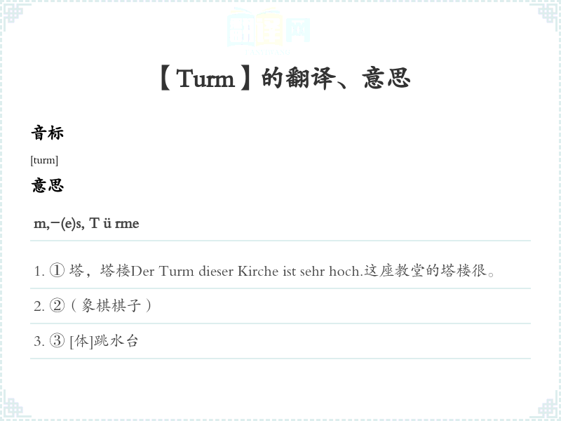 ① 塔,塔楼Der Turm dieser Kirche ist sehr hoch.这座教堂的塔楼很。