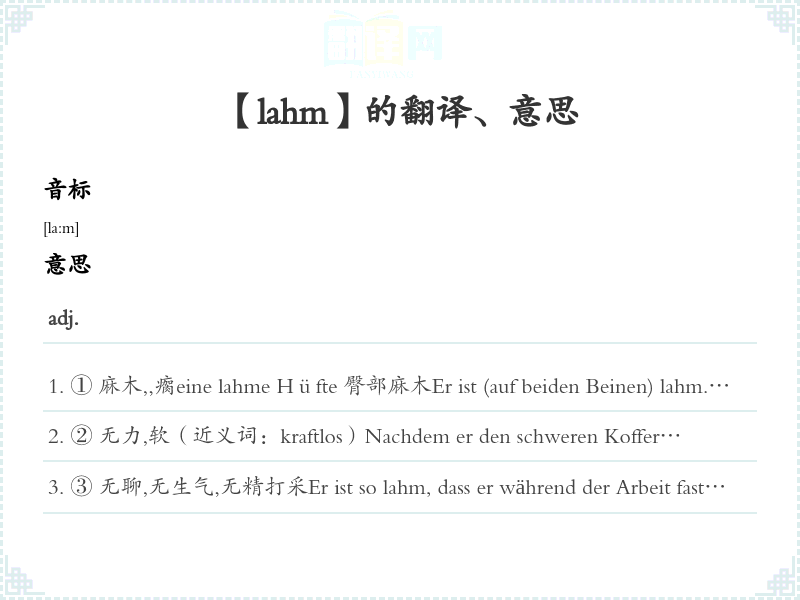 ③ 无聊,无生气,无精打采Er ist so lahm, dass er während der Arbeit fast einschläft.他无精打采,工作时差点睡着。Die Debatte war ziemlich lahm.辩论很无聊。