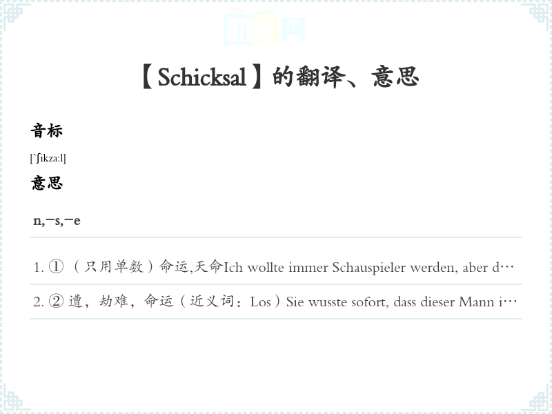 ② 遭,劫难,命运(近义词:Los)Sie wusste sofort, dass dieser Mann ihr Schicksal war.马上意识到这个男人关重要。