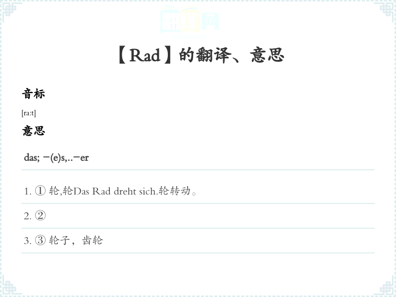 ⑤ (某些雄性禽类所展开的)扇状尾羽Ein Pfau schlägt ein Rad.孔雀开屏。