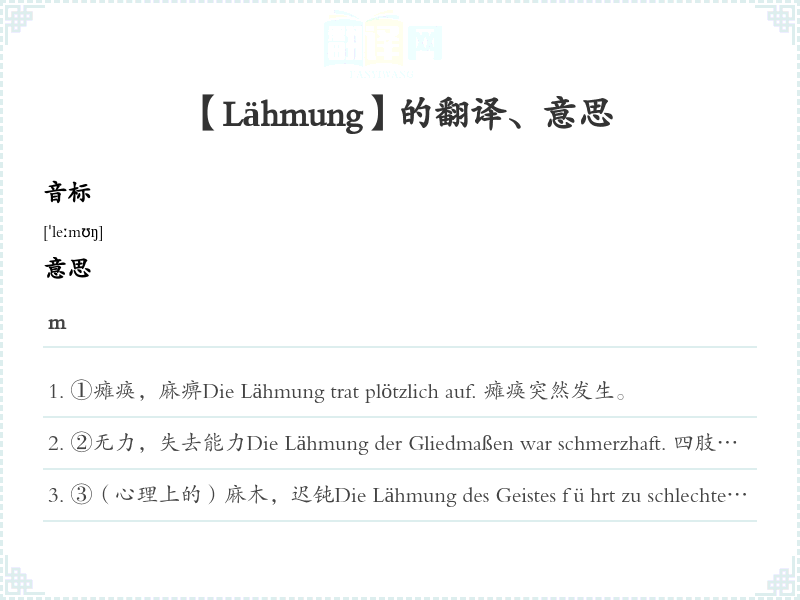 ①瘫痪,麻痹Die Lähmung trat plötzlich auf. 瘫痪突然发生。