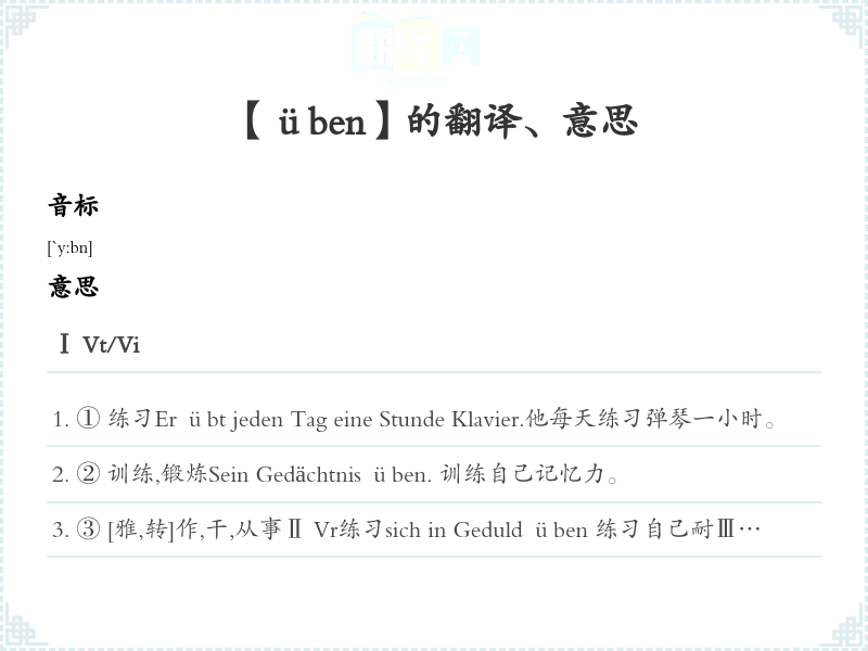 ③ [雅,转]作,干,从事Ⅱ Vr练习sich in Geduld üben 练习自己耐Ⅲ geübt→ üben二分词经过训练,训练有素,熟练in etw. geübt sein 在某方面训练有素语法搭配sich+四格, +四格, in+三格, in+四格, an+三格