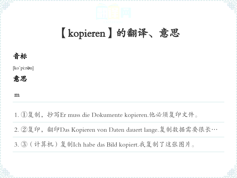 ①复制,抄写Er muss die Dokumente kopieren.他必须复印文件。