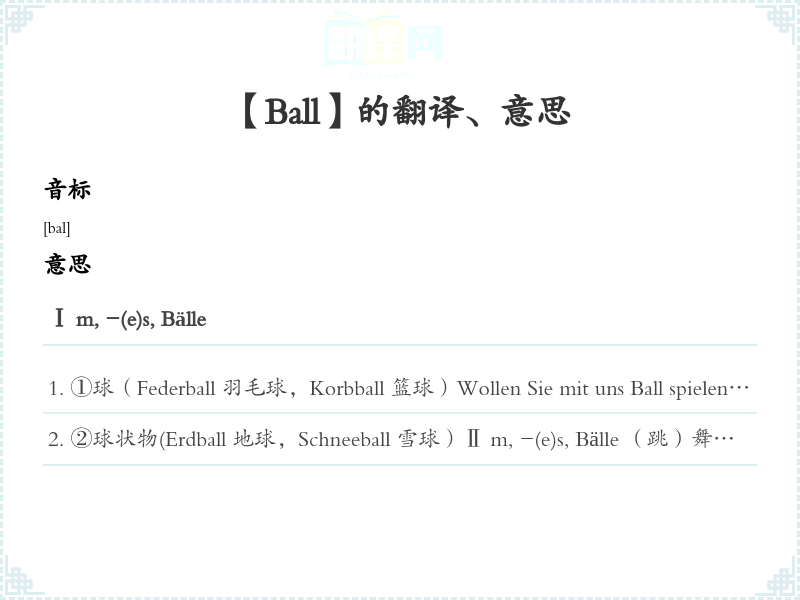 ②球状物(Erdball 地球,Schneeball 雪球)Ⅱ m, -(e)s, Bälle (跳)舞会Heute will ich einen Ball veranstalten.今天行一舞会。Ⅲ m, -(e)s, Bälle 猎狗的狂吠