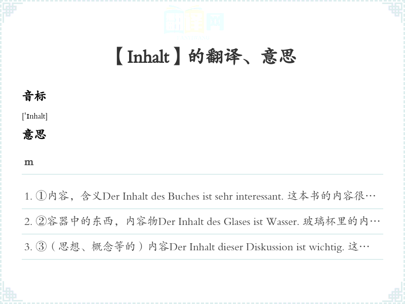 ②容器中的东西,内容物Der Inhalt des Glases ist Wasser. 玻璃杯里的内容是水。