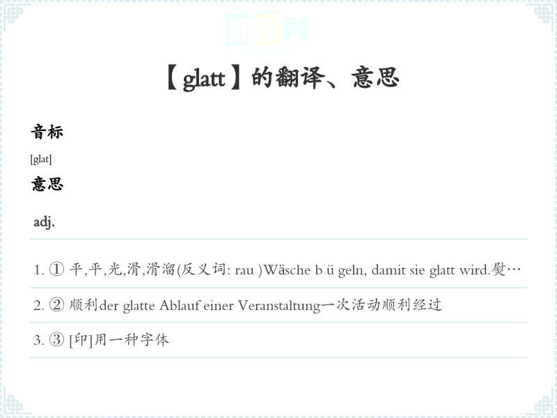 ① 平,平,光,滑,滑溜(反义词: rau )Wäsche bügeln, damit sie glatt wird.熨烫衣服使其平整
