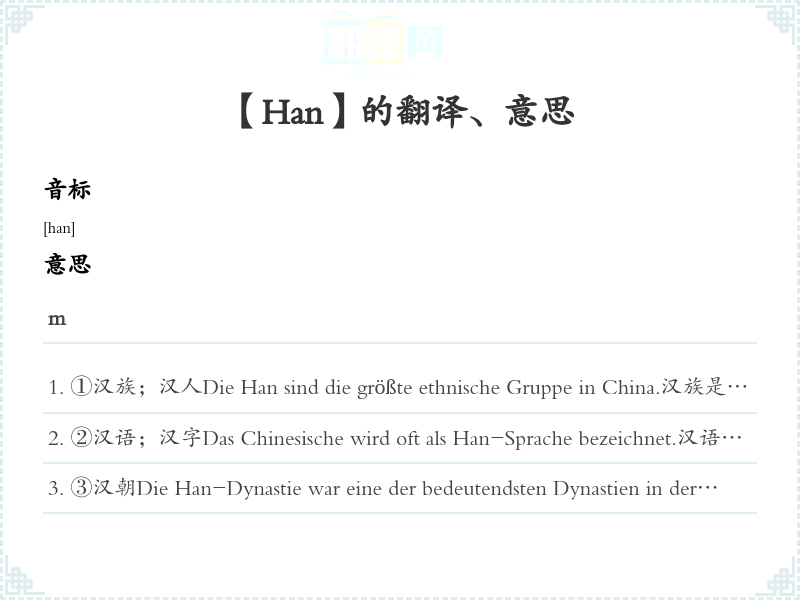 ②汉语;汉字Das Chinesische wird oft als Han-Sprache bezeichnet.汉语通常被称为汉语。