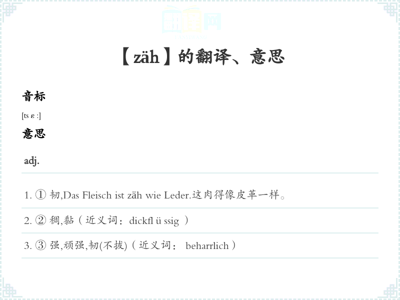 ① 韧,Das Fleisch ist zäh wie Leder.这肉得像皮革一样。