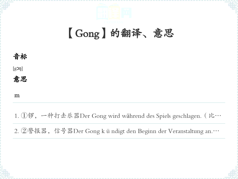 ②警报器,信号器Der Gong kündigt den Beginn der Veranstaltung an.(锣声宣布活动的开始。)