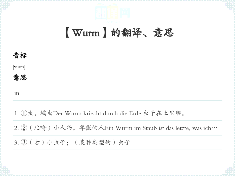 ①虫,蠕虫Der Wurm kriecht durch die Erde.虫子在土里爬。