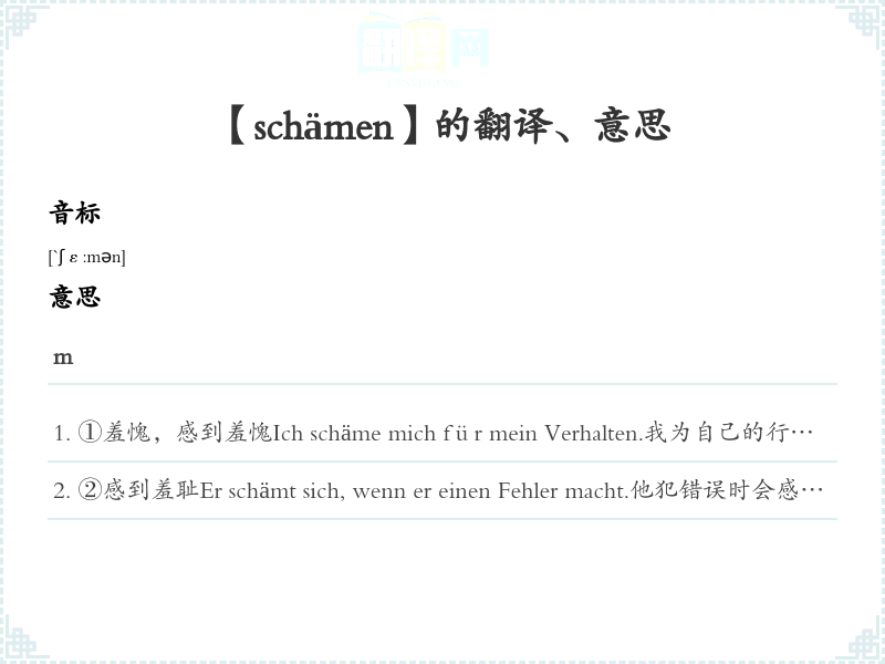 ①羞愧,感到羞愧Ich schäme mich für mein Verhalten.我为自己的行为感到羞愧。