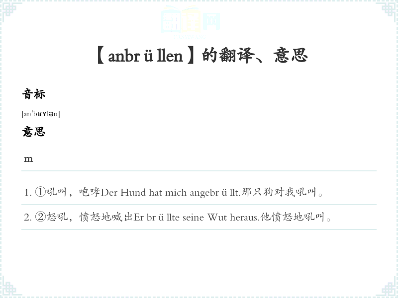 ①吼叫,咆哮Der Hund hat mich angebrüllt.那只狗对我吼叫。