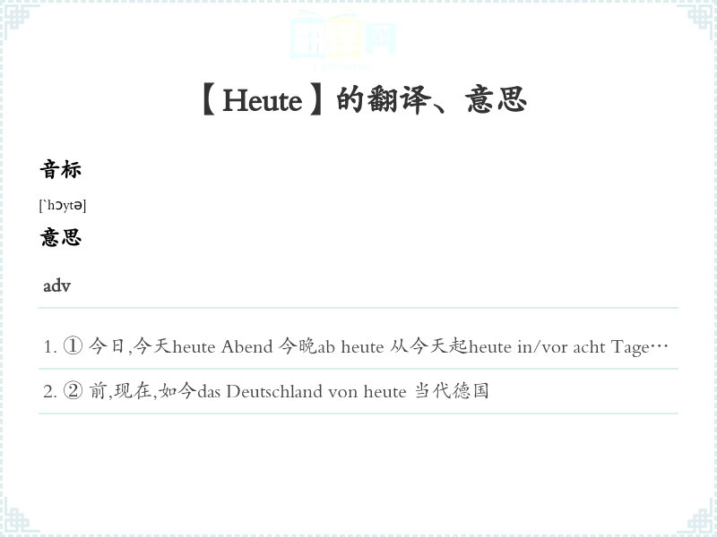 ① 今日,今天heute Abend 今晚ab heute 从今天起heute in/vor acht Tagen 一星期前的今天die Zeitung von heute 今天的