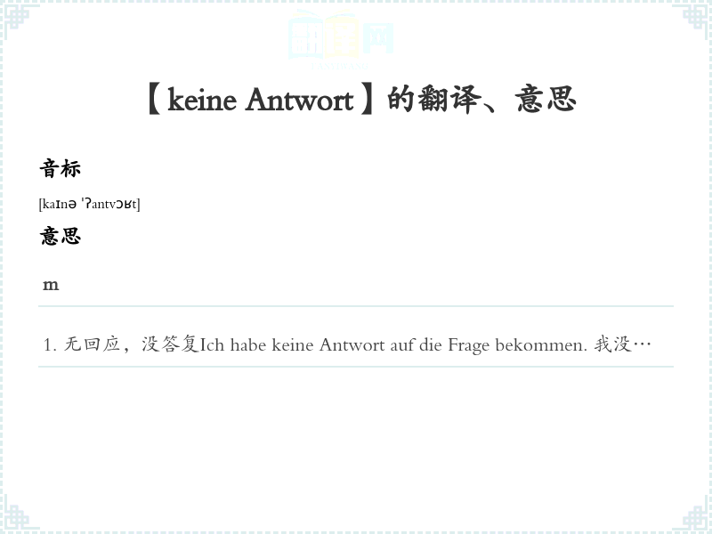 无回应,没答复Ich habe keine Antwort auf die Frage bekommen. 我没有得到这个问题的回答。