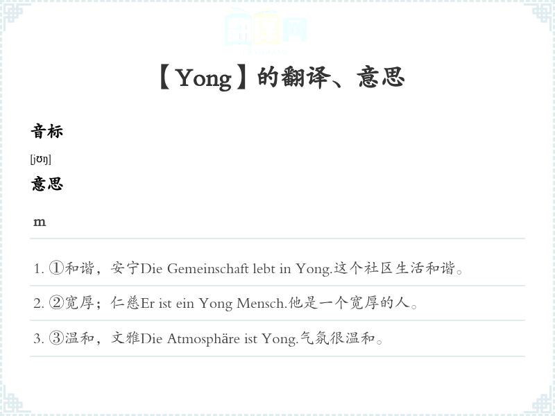 ③温和,文雅Die Atmosphäre ist Yong.气氛很温和。