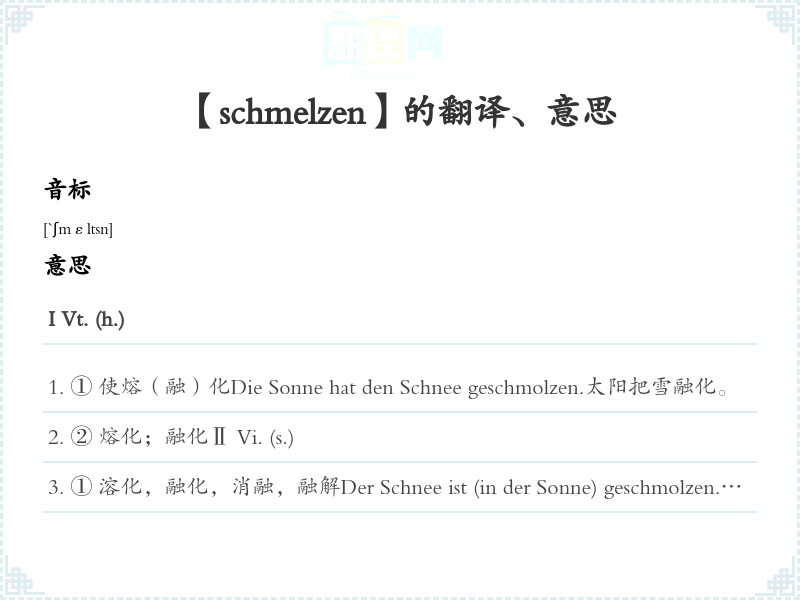① 使熔(融)化Die Sonne hat den Schnee geschmolzen.太阳把雪融化。