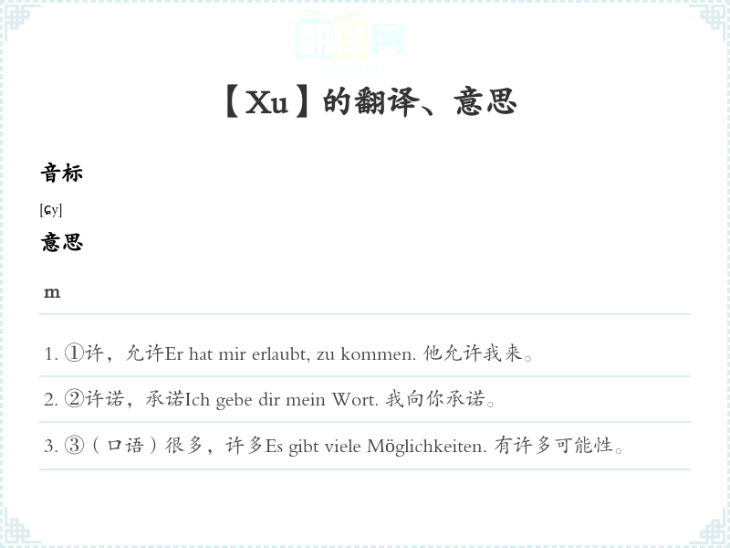 ①许,允许Er hat mir erlaubt, zu kommen. 他允许我来。