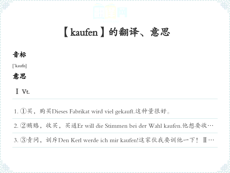 ③责问,训斥Den Kerl werde ich mir kaufen!这家伙我要训他一下!Ⅱ Vi.买Bei wem kaufen Sie?您在哪家商店买东西?语法搭配+四格, sich+三格, sich+四格, +三格, mit+三格, von+三格, bei+三格