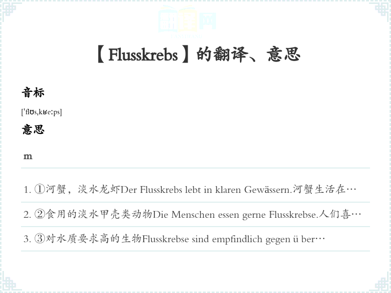 ②食用的淡水甲壳类动物Die Menschen essen gerne Flusskrebse.人们喜欢吃河蟹。