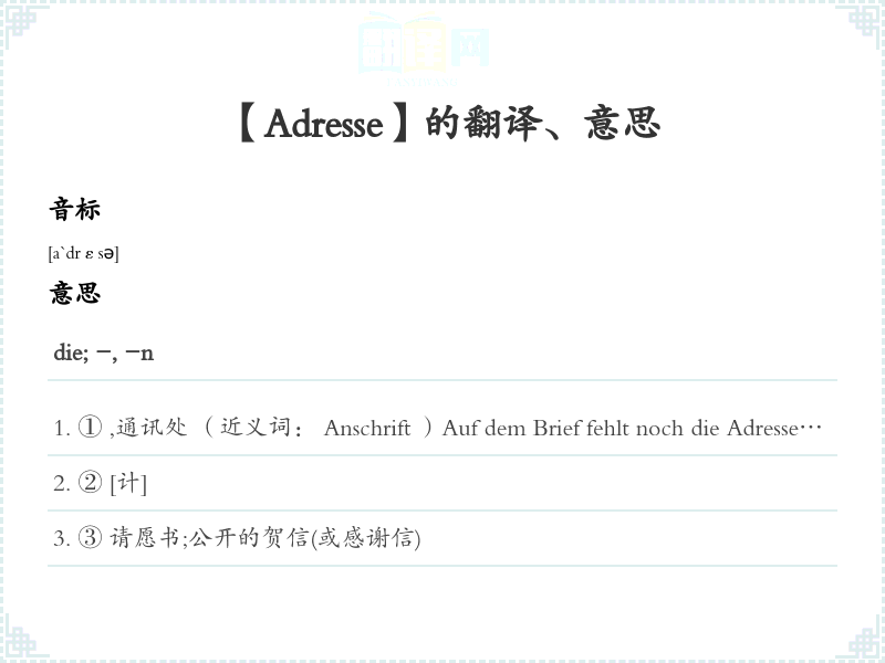 ① ,通讯处 (近义词: Anschrift )Auf dem Brief fehlt noch die Adresse des Absenders.信上还没写通讯人。