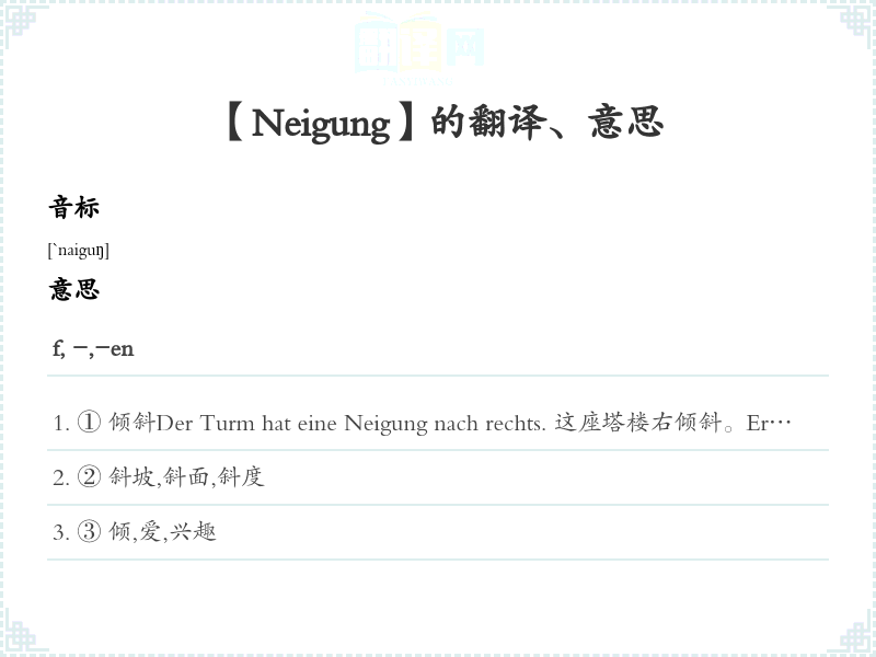 ① 倾斜Der Turm hat eine Neigung nach rechts. 这座塔楼右倾斜。Er begrüßte sie mit einer leichten Neigung des Kopfes.他微微倾斜身子她问。