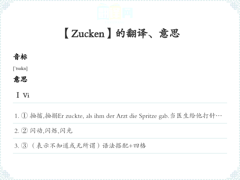 ① 抽搐,抽搦Er zuckte, als ihm der Arzt die Spritze gab.当医生给他打针是,他抽搐了一下。