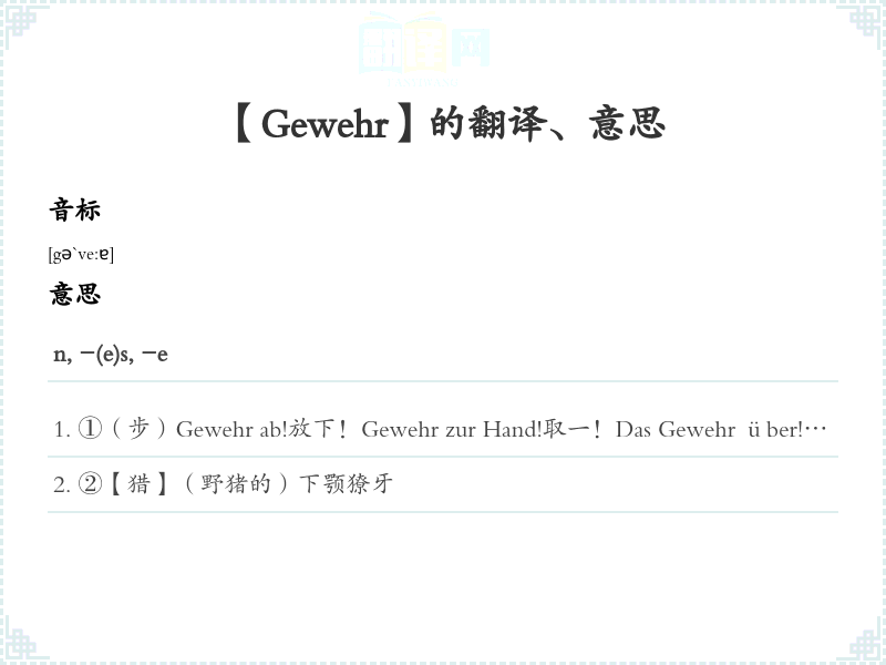 ①(步)Gewehr ab!放下!Gewehr zur Hand!取一!Das Gewehr über!托!