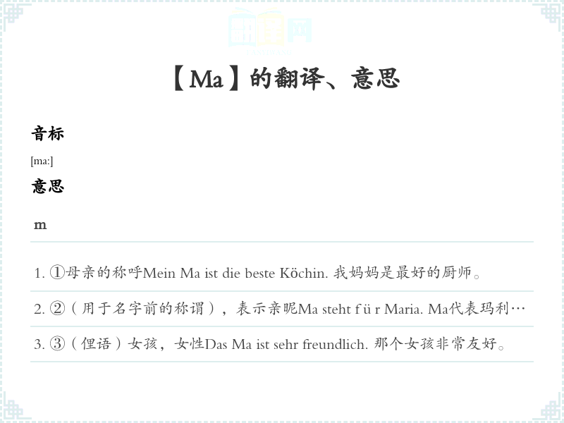 ②(用于名字前的称谓),表示亲昵Ma steht für Maria. Ma代表玛利亚。