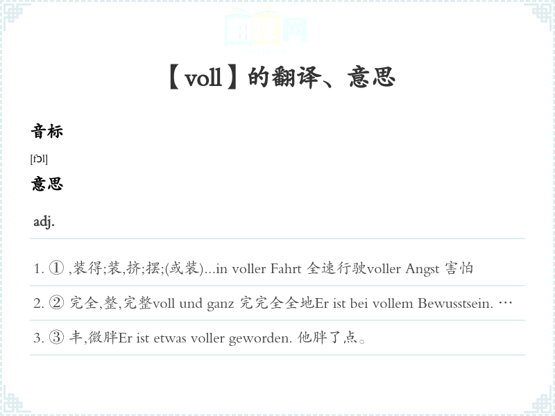 ② 完全,整,完整voll und ganz 完完全全地Er ist bei vollem Bewusstsein. 他是完全清醒。ein volles Dutzend 整整一打aus vollem Herzen danken 衷心地感谢