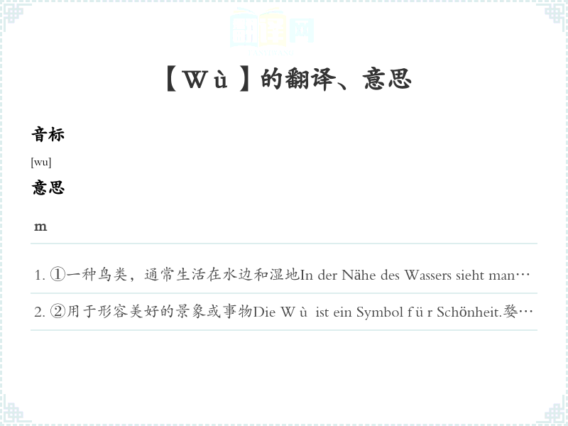 ①一种鸟类,通常生活在水边和湿地In der Nähe des Wassers sieht man oft Wù.在水边通常可以看到婺。