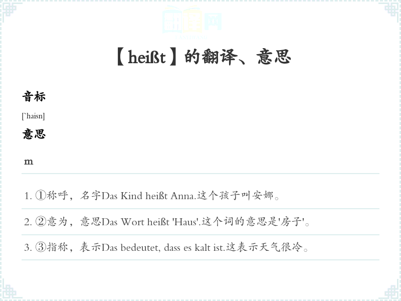 ②意为,意思Das Wort heißt 'Haus'.这个词的意思是'房子'。