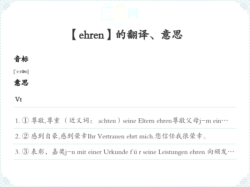 ① 尊敬,尊重 (近义词: achten)seine Eltern ehren尊敬父母j-m ein ehrendes Andenken bewahren 怀着崇敬心情缅怀