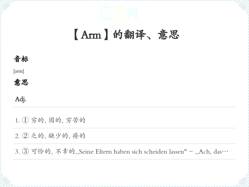 ③ 可怜的, 不幸的,,Seine Eltern haben sich scheiden lassen" - ,,Ach, das arme Kind!"他父母离婚了。唉,可怜的孩子。