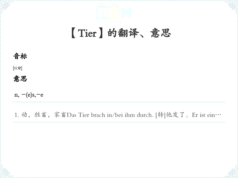动,牲畜,家畜Das Tier brach in/bei ihm durch. [转]他发了。Er ist ein hohes Tier in der Politik.他是政界要人。