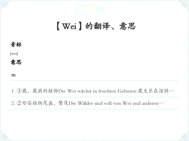 ②形容植物茂盛,繁茂Die Wälder sind voll von Wei und anderen Pflanzen.森林里满是葳和其他植物。