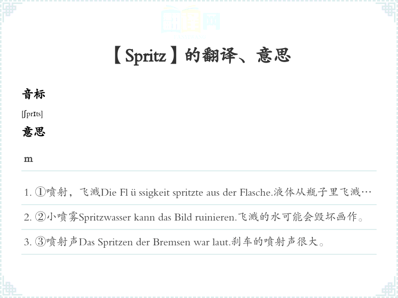 ①喷射,飞溅Die Flüssigkeit spritzte aus der Flasche.液体从瓶子里飞溅出来。