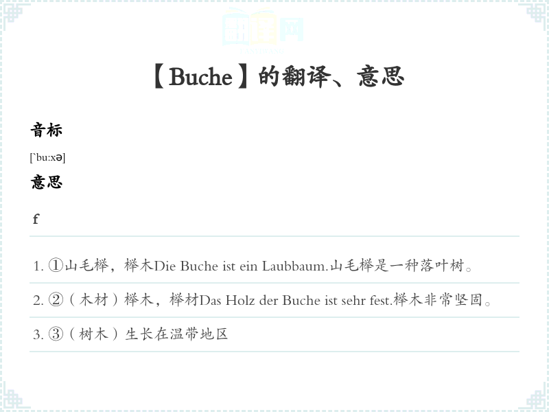 ②(木材)榉木,榉材Das Holz der Buche ist sehr fest.榉木非常坚固。