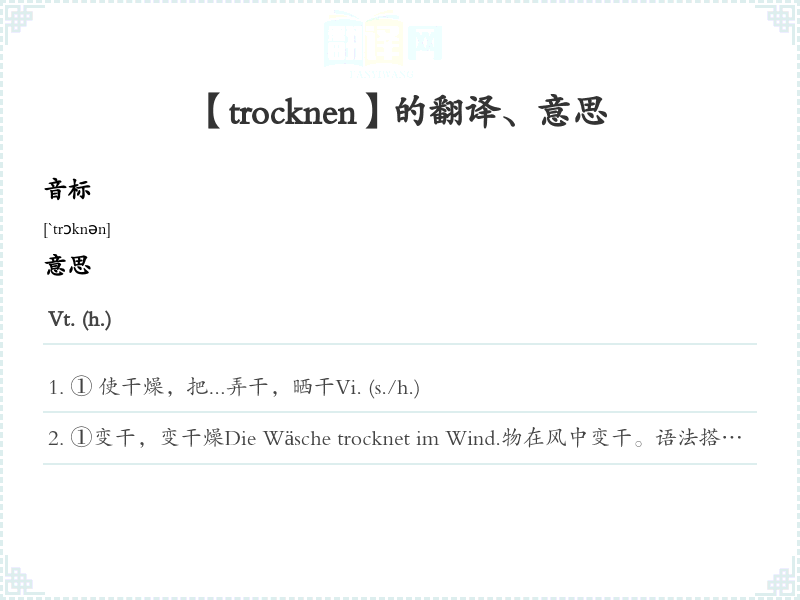 ①变干,变干燥Die Wäsche trocknet im Wind.物在风中变干。语法搭配+四格, sich+四格, mit+三格