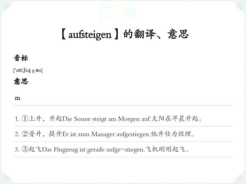 ①上升,升起Die Sonne steigt am Morgen auf.太阳在早晨升起。