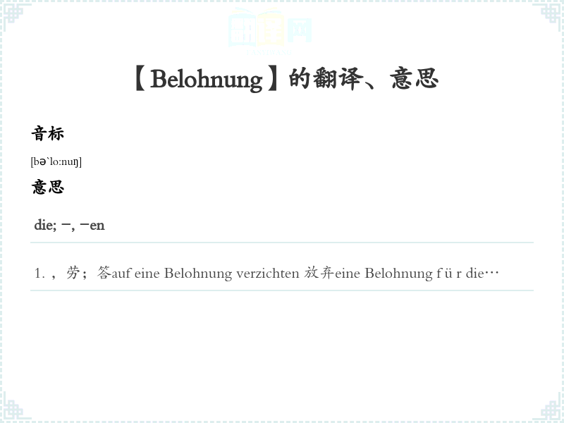 ,劳;答auf eine Belohnung verzichten 放弃eine Belohnung für die Aufklärung eines Verbrechens aussetzen悬赏查明罪行als Belohnung (或 zur Belohnung) für etw. 作为对某事的